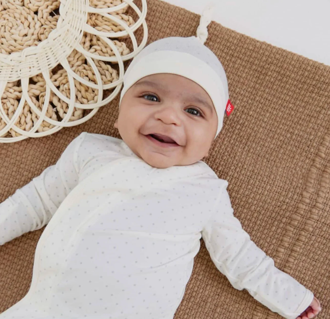 Our modal Gown & Hat Set is a newborn, late-night must-have. Magnets take diaper changes to a new level of fuss-free efficiency, while a closed bottom keeps toes and feet warm and cozy—which is mission critical during your third middle-of-the-night change. Other amazing features include the silkiest, softest modal fabric and built-in mitten cuffs.
