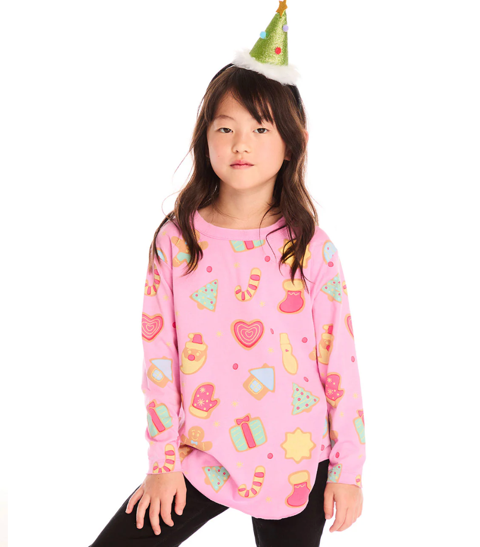 Featuring a playful Christmas cookies motif on the softest pink fabric, this lounge tee is perfect for showing off her sweet side.