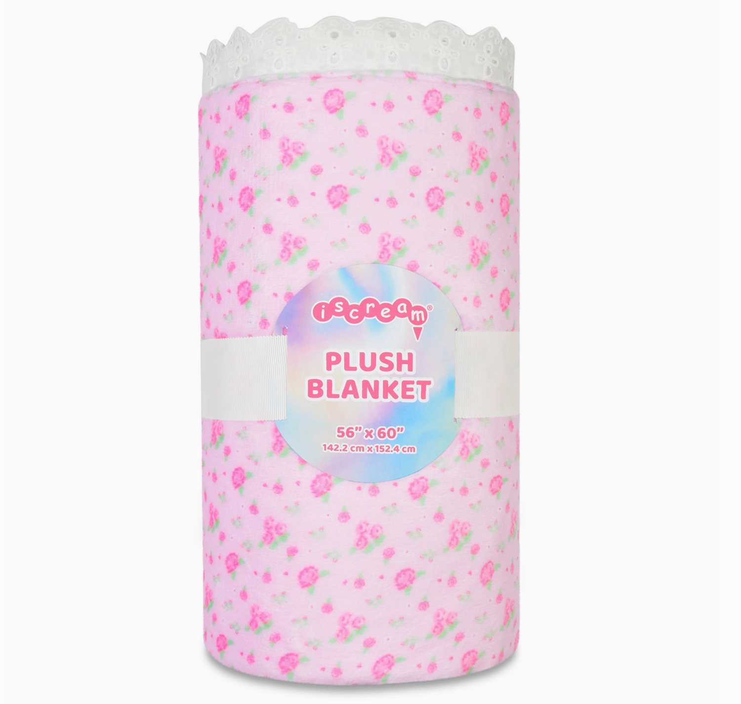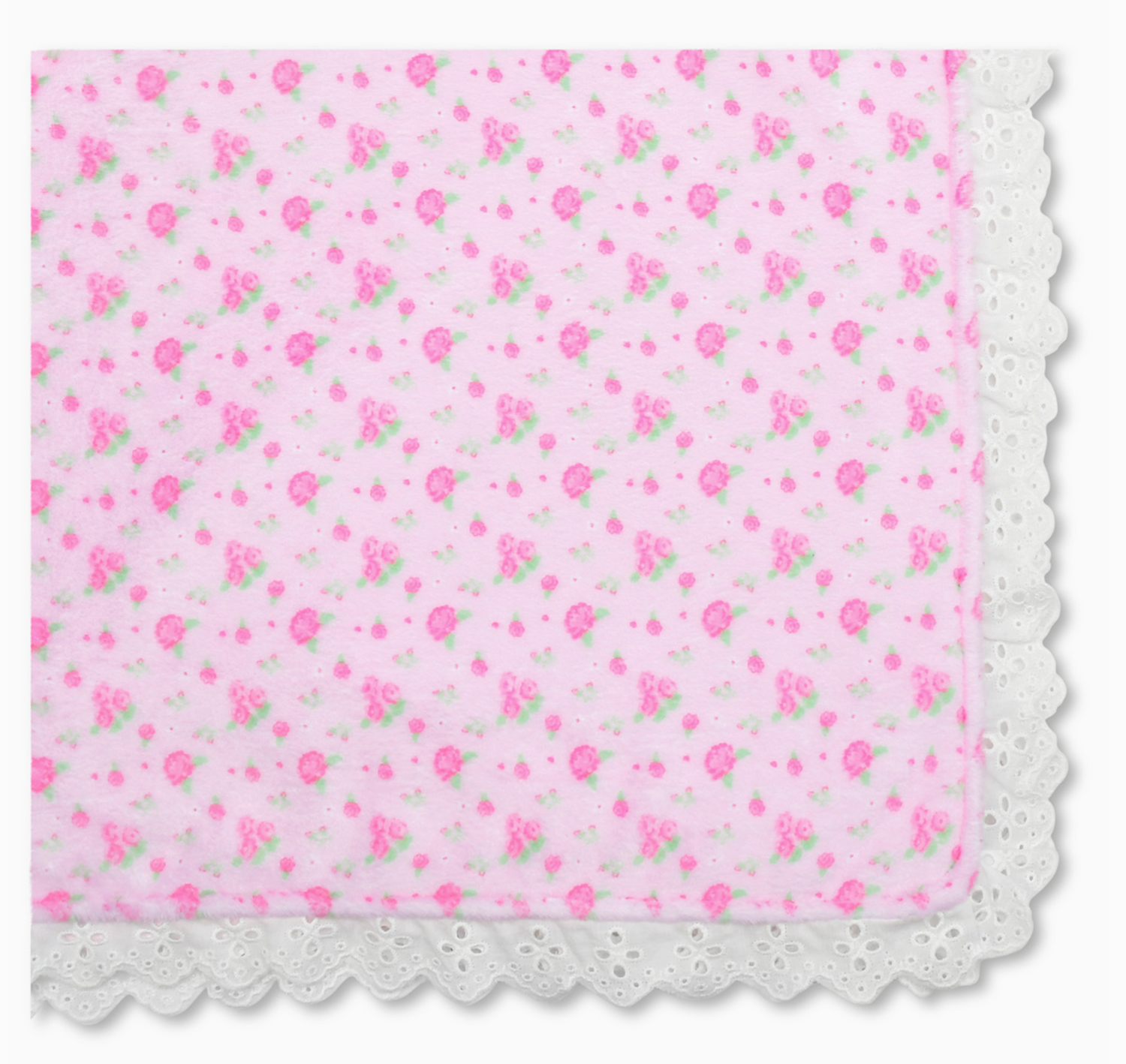 This ultra-soft throw features a delicate pink flower print on a lovely soft pink background, elevated by a beautiful lace trim accent for a touch of vintage charm.