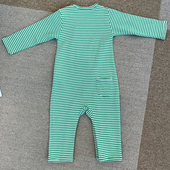 A festive holiday outfit for your little one to wear this holiday season! A bright & cheery kelly green stripe romper with Santa and his best buddy, Rudolph!