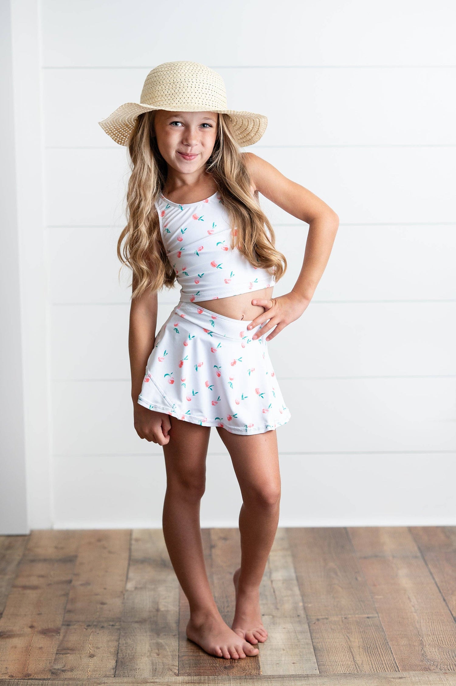 This adorable two-piece set features a crisp white & peach tank top with a cheeky back detail that'll have everyone asking where you got it. The matching skirt comes with built-in shorts underneath, so you can move freely without any worries.
