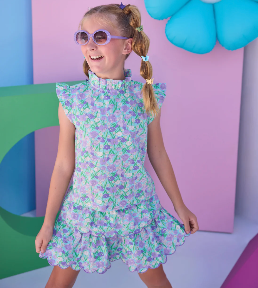 Playful and stylish! The Tiered Mini Skort features a fun pink floral tiered skirt with scalloped edges. The best part? It has built-in shorts! Pair it with one of our Eyelet Tops for an everyday look or dress it up with the matching Tinsley Top - either way, it's an extra versatile skort your trendsetter will wear over and over again.