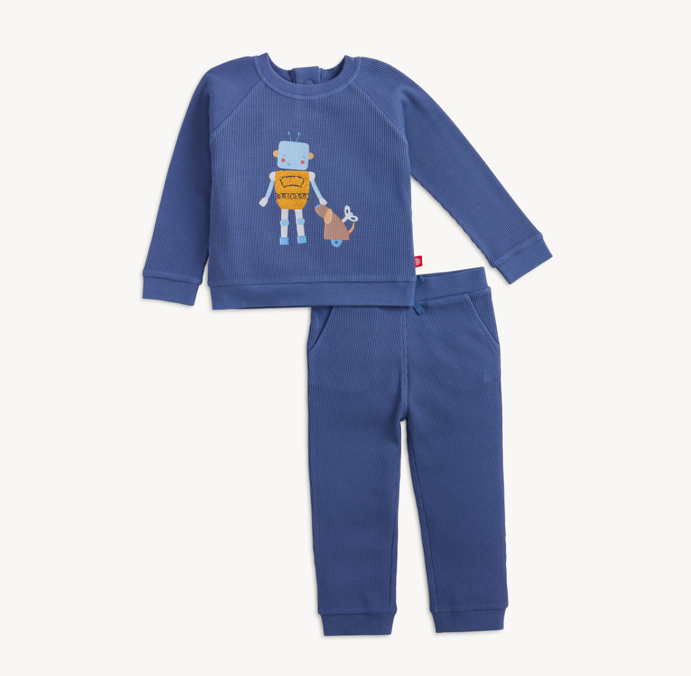 All of the comfort they'll ever need in a Sweatsuit, made with magnets to make getting dressed for the day easy and fun. It's made of a super soft knit with a fuzzy, brushed interior, perfect for cozying up on the couch or raising hands high in class.
