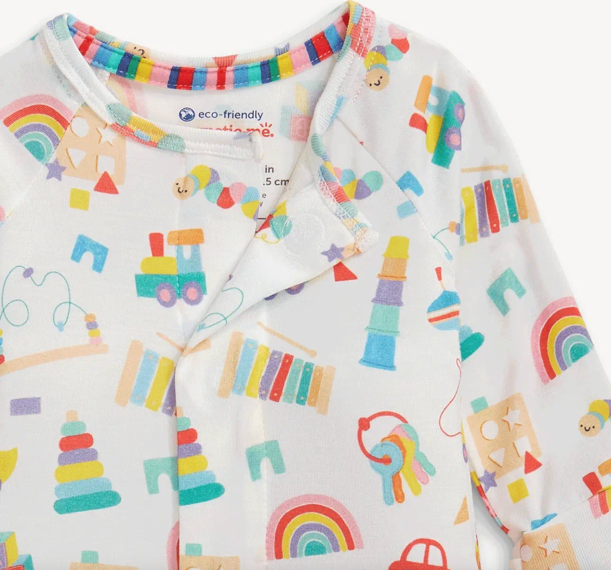 - Magnetic closures: magnets line the seam from the neck to upper thigh for sizes up to 0-3m & from neck to crotch for sizes 3-6m and up.