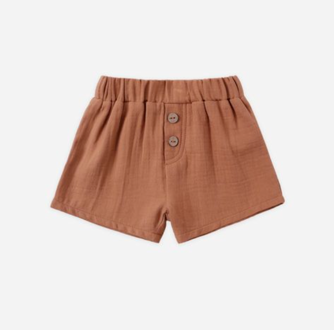 Woven short featuring an elastic waist and a mock fly with two buttons.