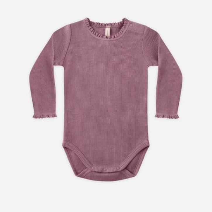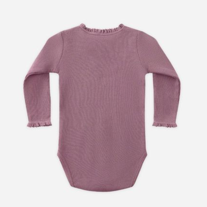 Long sleeve onesie in our lightweight waffle knit, featuring the sweetest crochet lace ruffle detail. Designed with shoulder and bottom snaps for easy changes.