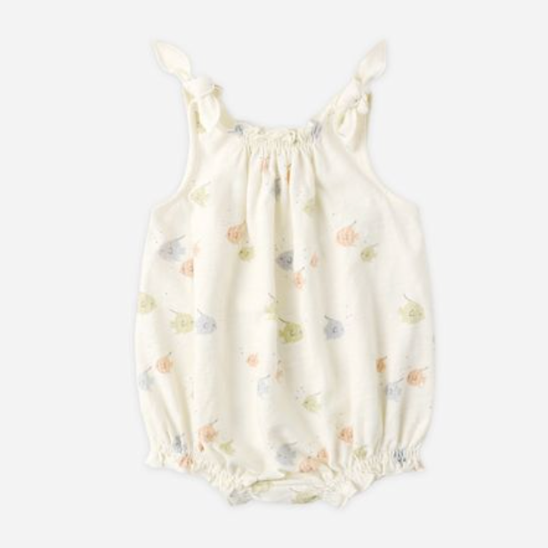 This soft bubble onesie features fixed tie shoulder straps and bottom snaps for easy changes.