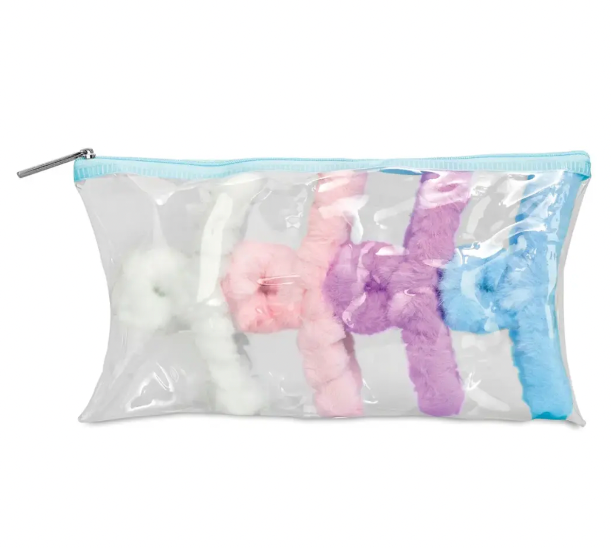 Soft fleece furry material; Set of 4 clips in plastic case; Zipper closure