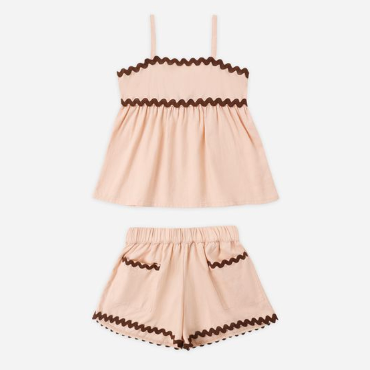 Our Ric Rac Set is a light and flowy set that features ric rac trim along neckline and waist seam, a gathered babydoll silhouette and matching wide-leg shorts with an elastic waistband. This set is an easy go-to for everyday wear.