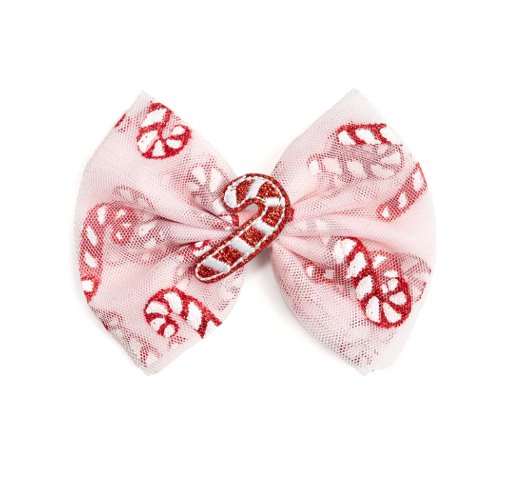 - Candy cane printed tulle bow with a red and white glitter candy cane motif