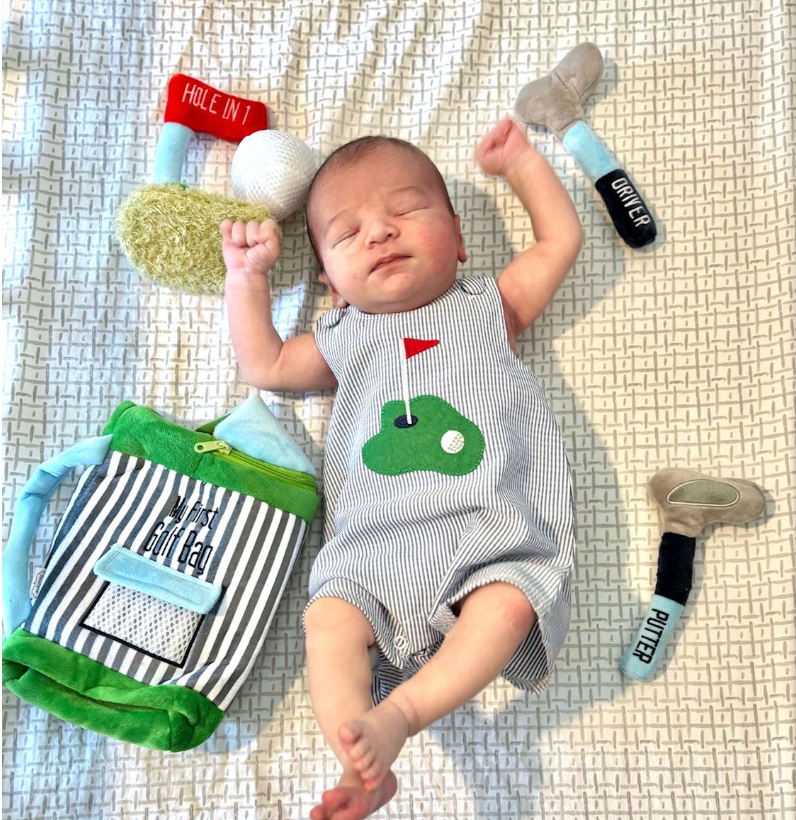 Interactive so-soft plush golf bag holds plush golf ball, driver, putter and putting green with kid friendly crinkle and rattle noises for hours of imaginary play.