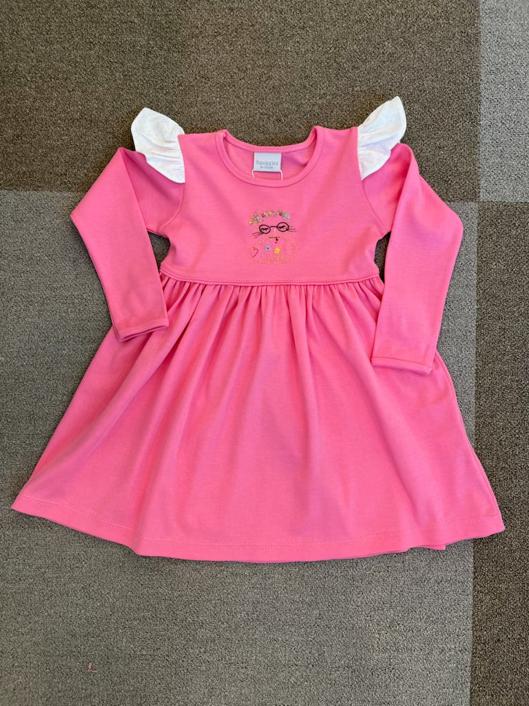 This adorable play dress is custom designed for Magpies Paducah! In this 100% Peruvian cotton dress, she has sweet ruffled shoulders, a happy pink hue, and a sweet little kitty appliqued on the chest.